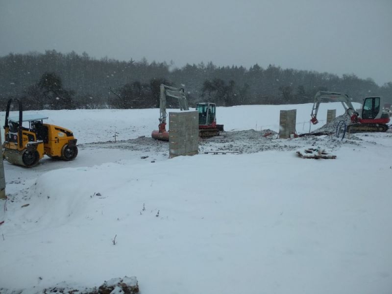 Na pozemku našeho projektu, kde vyroste 67 rodinných domů se nyní připravují podkladní vrstvy pro komunikaci mezi řadovými domy a protihlukovým valem. I v zimě se na Vyladěných domech pracuje, jako by se nechumelilo.